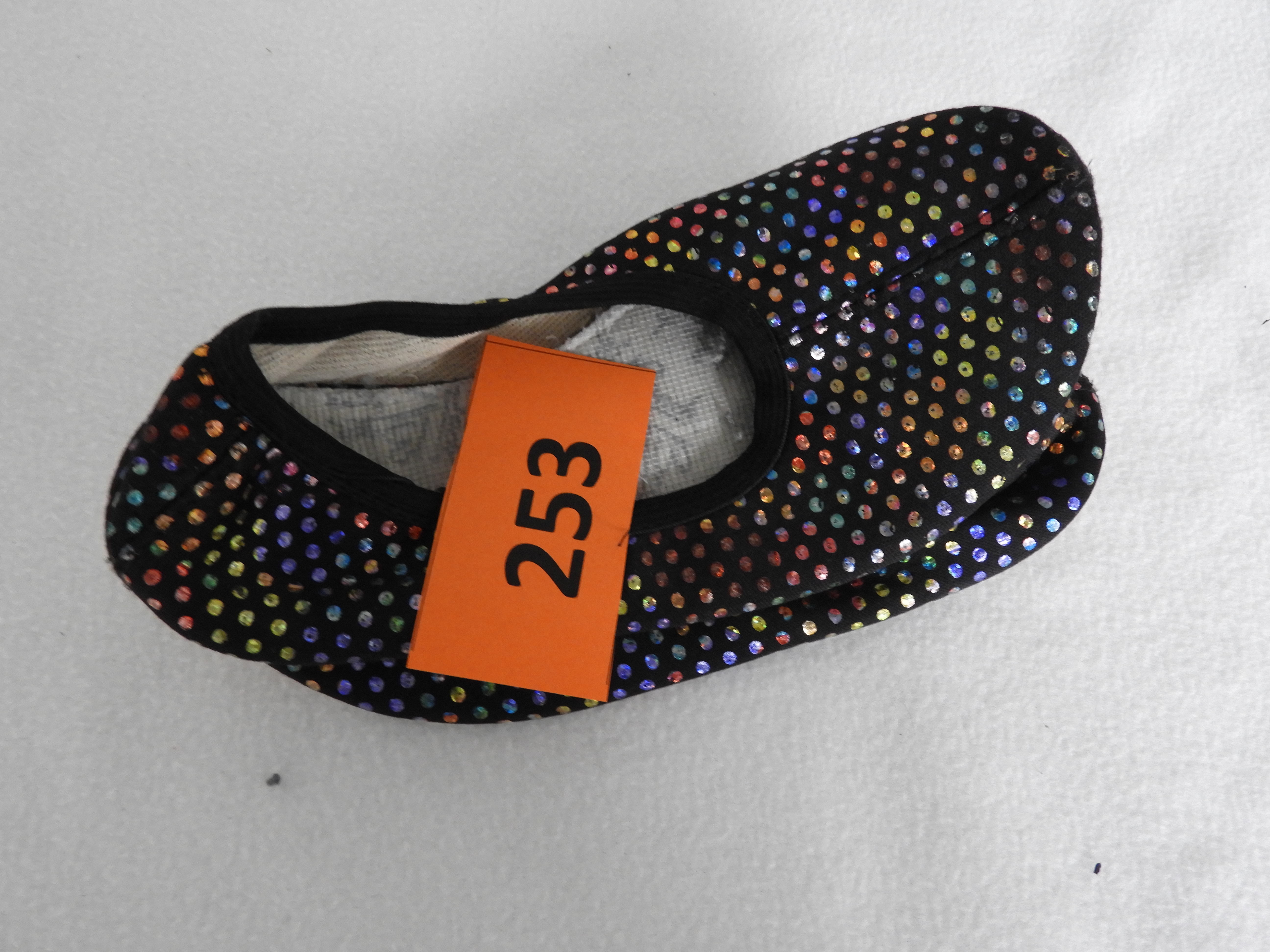 Turnschläppchen, Grundfarbe schwarz, bunte Punkte.