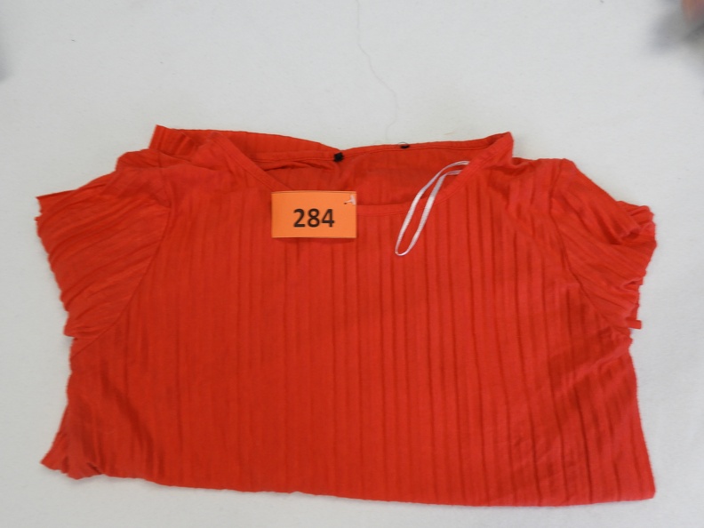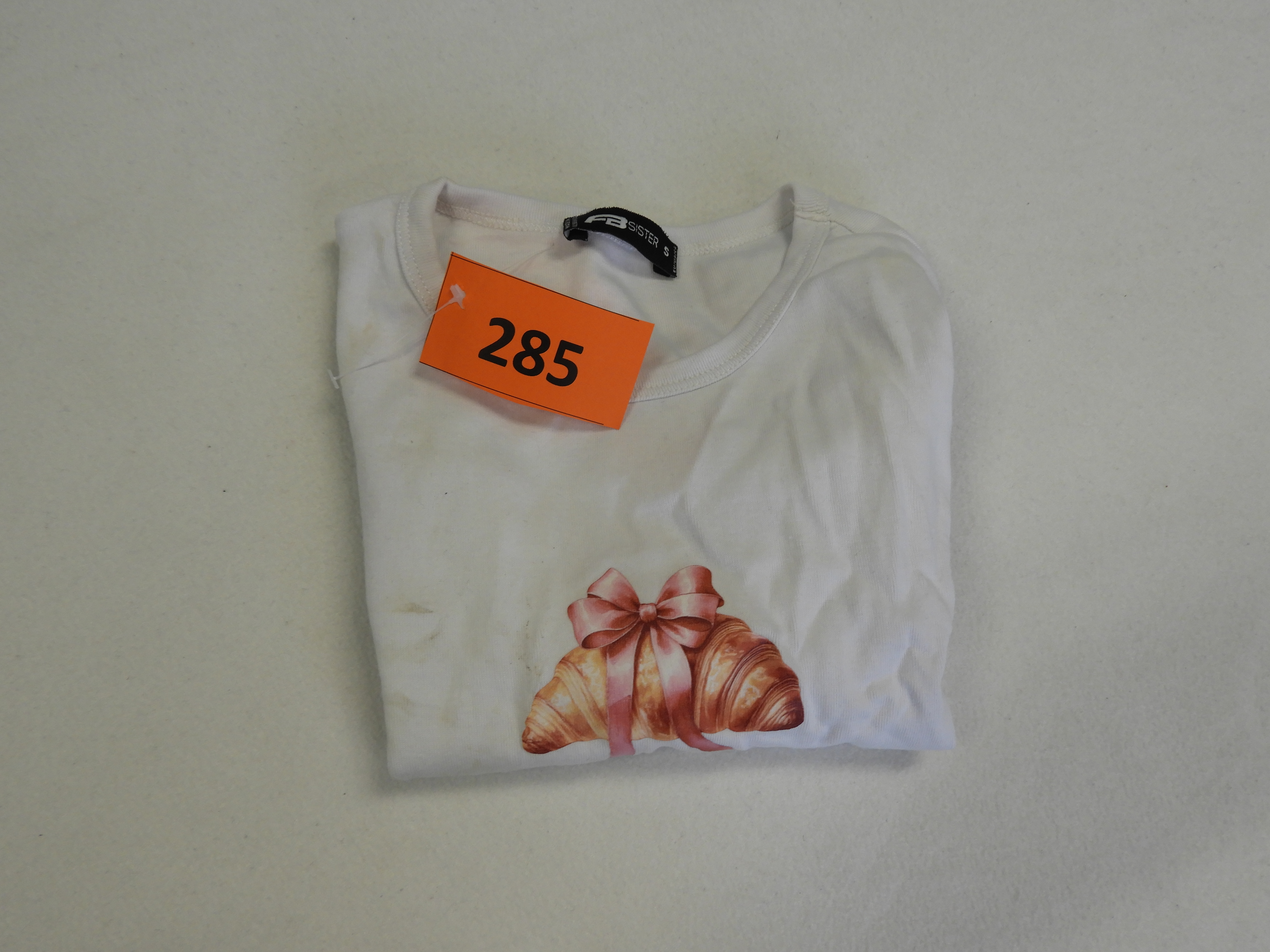Weißes T-Shirt der Marke "Fb Sister", Gr. S mit Aufdruck Croissant mit Schleife.